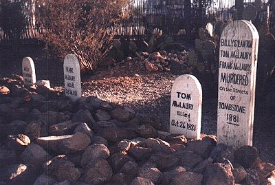 | Billy, Frank and Tom's graves I paid respects to the kin-folk at least twice a day while I was there (half the time just trying to get a good picture!!). I've talked myself into believing it was the wind in the trees and my imagination but, damned if I didn't hear a barely audible whispering voice in my ear while standing here by myself one of the days. I did see some spirits too. But that was a the Crystal Palace & Big Nose Kates! |